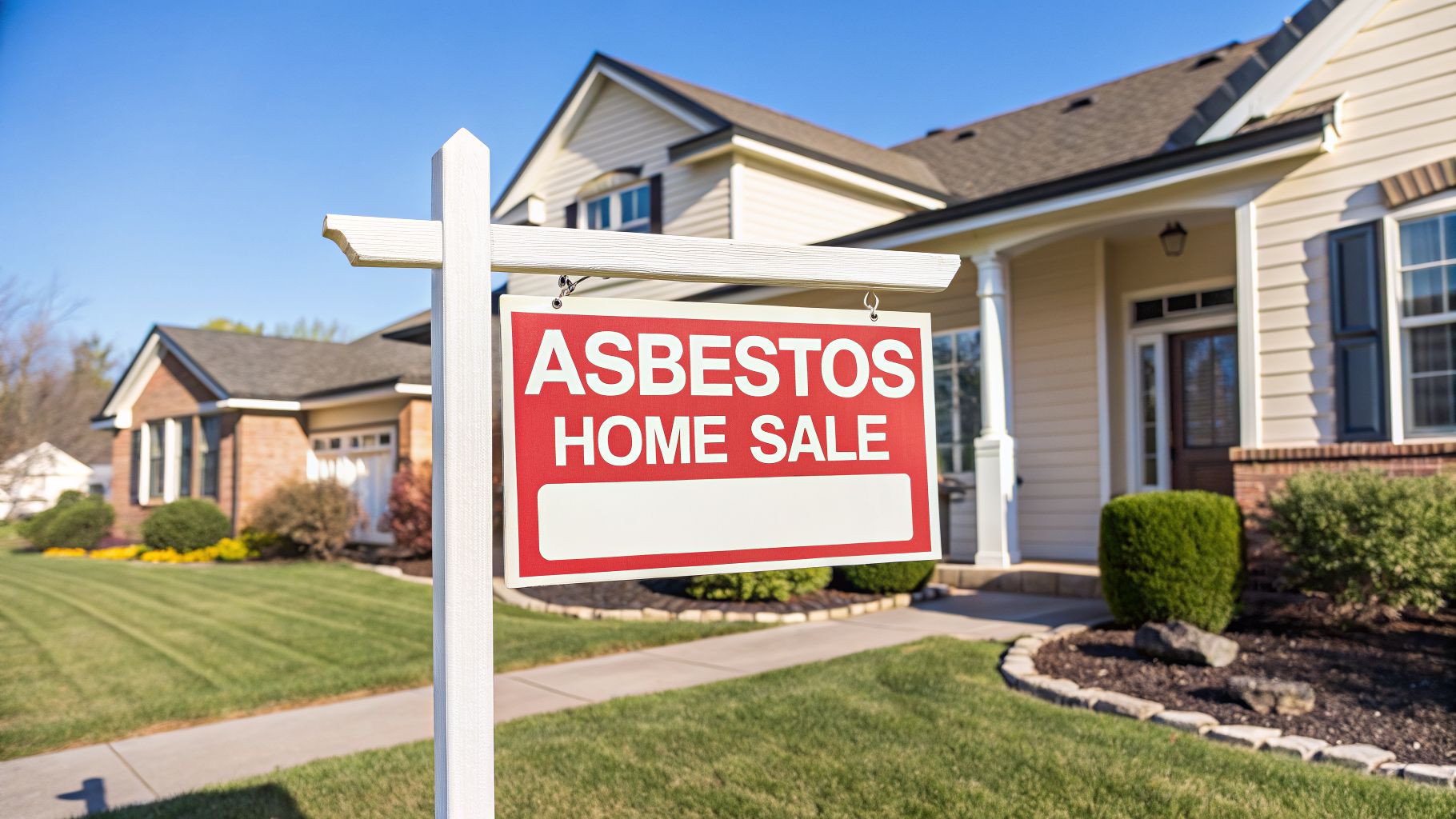 A house with a 'SELL with Asbestos' banner on a residential street with other homes and bare trees.